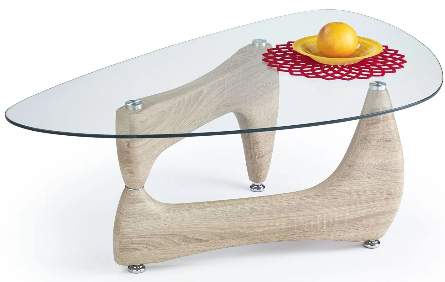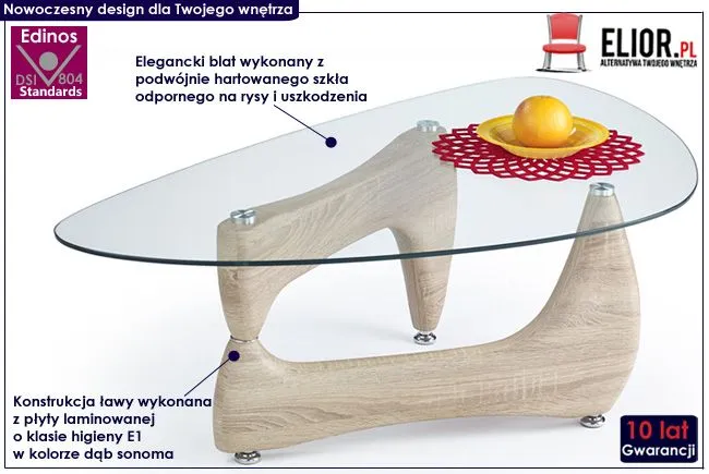 Komfortowy stolik kawowy Soberi to najnowsze przedsięwzięcie młodych europejskich projektantów. Wyróżnia się nie tylko swoją praktyczną formą i niebanalnym kształtem, ale także zastosowaniem materiałów najlepszej jakości. To dlatego cieszy się on powodzeniem wśród osób lubiących nowatorskie rozwiązania. Konstrukcja ławy wykonana została z laminowanej płyty meblowej, uszlachetnionej cienkimi filmami melaminowymi. Posiada także specjalne włókna ułożone różnokierunkowo, co zapewnia nadanie jej cech jakościowych oraz wytrzymałościowych. Designerski blat o owalnym kształcie wyprodukowano z podwójnie hartowanego szkła, dzięki czemu jest całkowicie odporny na rysy i uszkodzenia. Ława Soberi dodaje wnętrzu harmonii i elegancji, a każda kawa przy niej wypita smakuje doskonale. Podaruj Twoim czterem kątom nieco naturalnego ciepła, harmonizując je ze świeżością delikatnych kolorów.