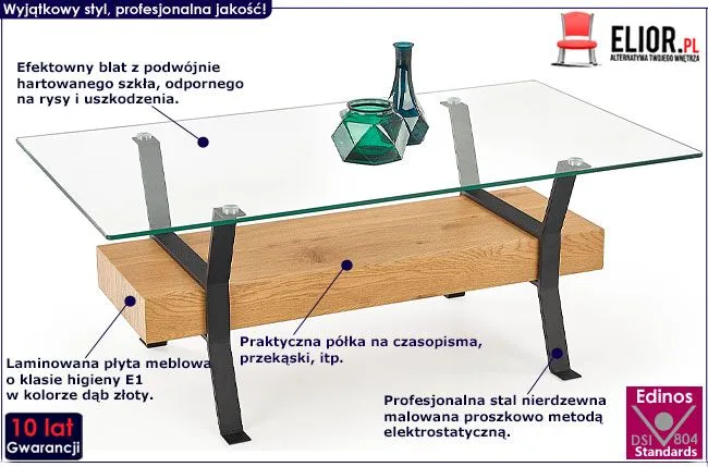 Kolor: Blat przezroczysty, półka w kolorze złoty dąb, nóżki czarne. Kliknij w link i sprawdź także inne prostokątne ławy w sklepie Edinos.pl. Stwórz swój praktyczny zestaw mebli.