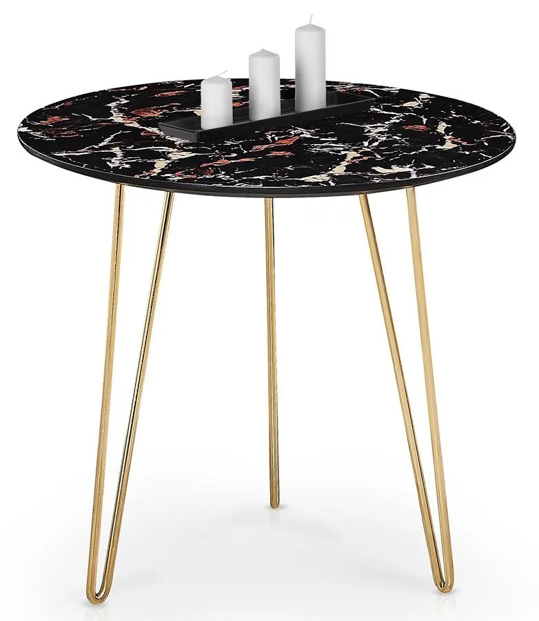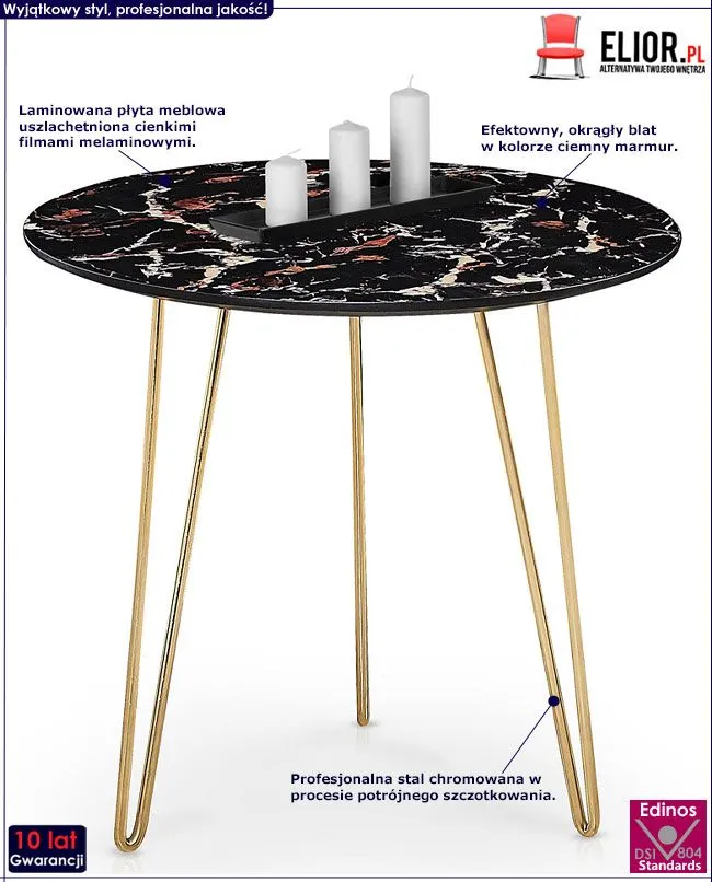 Komfortowa w użytkowaniu i atrakcyjna wizualnie okrągła ława Vefo w kolorze ciemny marmur wyróżnia się nie tylko swoją niebanalną formą i praktycznym kształtem, ale także zastosowaniem materiałów najwyższej jakości. To dlatego cieszy się ona powodzeniem wśród osób wybierających niebanalne rozwiązania. Lekka i delikatna konstrukcja ławy w kolorze złotym stworzona jest z najwyższej jakości chromowanej stali o zawartości aż stali nierdzewnej oraz chromu, co gwarantuje mu niezwykły efekt wizualny, posiadając przy tym ponadprzeciętne cechy antykorozyjne oraz lepszą odporność na uszkodzenia mechaniczne . Efektowny, okrągły blat ławy w kolorze ciemny marmur wyprodukowano z najwyższej jakości laminowanej płyty meblowej o klasie higieny E1, uszlachetnionej cienkimi filmami melaminowymi. Posiada także specjalne włókna ułożone różnokierunkowo o strukturze sinusoidalnej, co zapewnia nadanie jej cech jakościowych oraz wytrzymałościowych. Stonowana kolorystyka i prosta forma sprawiają, że stolik kawowy Vefo doskonale odnajduje się we wnętrzach mieszkalnych lub komercyjnych urządzonych zarówno w stylu minimalistycznym, jak też skandynawskim czy nowoczesnym. Ława Elior nadaje wnętrzu harmonii i modnego świeżego designu, a każdy łyk kawy przy niej wypity pozwala Ci odetchnąć od codziennego zgiełku i pośpiechu. Nadaj Twojemu wnętrzu wyrazistego designu w ekspresyjnym, nowatorskim stylu z funkcjonalną ławą Vefo!