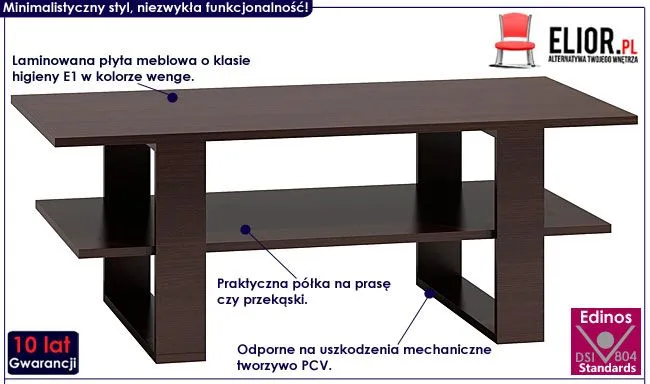 Przedstawiamy Ci zachwycający stolik kawowy Toverio z kolekcji Martis marki Elior. Produkty Elior charakteryzują się wyrazistym designem i dbałością o każdy szczegół mebla, a wdzięk i nowoczesność, jak również mocna i stabilna konstrukcja, to cechy najnowszego mebla Toverio. Ława wykonana została z laminowanej płyty meblowej o klasie higieny E1, uszlachetnionej cienkimi filmami melaminowymi. Posiada także specjalne włókna ułożone różnokierunkowo o strukturze sinusoidalnej, co zapewnia nadanie jej cech jakościowych oraz wytrzymałościowych. Dla zwiększenia wytrzymałości i trwałości mebla, obrzeża ławy wykończono odpornym na uszkodzenia mechaniczne tworzywem PCV. Duża półka na prasę czy przekąski jest niezwykle praktyczna i pomaga Ci zaoszczędzić miejsce na blacie głównym, a także utrzymać na nim porządek. Stonowana kolorystyka i prosta forma sprawiają, że stolik Toverio doskonale sprawdza się we wnętrzach urządzonych w stylu skandynawskim, jak też minimalistycznym czy nowoczesnym. Świetnie nadaje się także do wnętrz dziecięcych czy młodzieżowych. Stwórz w swoim domu niepowtarzalny i ciepły klimat z ławą marki Elior!