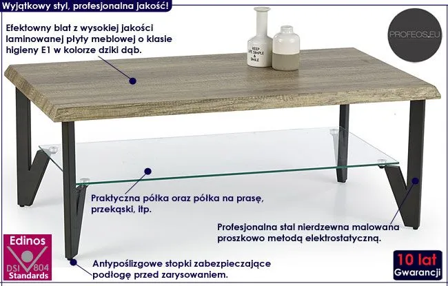 Komfortowa i efektowna ława Nuku wyróżnia się nie tylko swoją niebanalną formą i praktycznym kształtem, ale także zastosowaniem materiałów najlepszej jakości. To dlatego cieszy się ona powodzeniem wśród osób wybierających nowatorskie rozwiązania. Oryginalna w formie konstrukcja ławy w kolorze czarnym wykonana została z najwyższej jakości nierdzewnej stali malowanej proszkowo odpornym na zarysowania i zadrapania. Najwyższa jakość techniki polimeryzacji pozwoliła zaoferować firmie Profeos aż 10 lat gwarancji na swoje produkty. Już nie musisz się martwić, że po kilku latach część farby odpryśnie od mebla . Designerski, prostokątny blat ławy w kolorze dziki dąb wykonany został z laminowanej płyty meblowej o klasie higieny E1, uszlachetnionej cienkimi filmami melaminowymi. Posiada także specjalne włókna ułożone różnokierunkowo o strukturze sinusoidalnej, co zapewnia nadanie jej cech jakościowych oraz wytrzymałościowych. Efektowną półkę na prasę czy przekąski wyprodukowano z podwójnie hartowanego szkła o grubości 9 mm, dzięki czemu jest całkowicie odporna na rysy i uszkodzenia. Stonowana kolorystyka i prosta forma sprawiają, że stolik kawowy Nuku doskonale sprawdza się we wnętrzach urządzonych zarówno w stylu industrialnym, jak też minimalistycznym czy nowoczesnym. Ława Profeos dodaje wnętrzu harmonii i modnego "przemysłowego" designu, a każdy łyk kawy przy niej wypity pozwala Ci odetchnąć od codziennego zgiełku i pośpiechu. Nadaj Twojemu wnętrzu wyrazistego designu w ekspresyjnym, industrialnym stylu ze stolikiem kawowym Nuku!