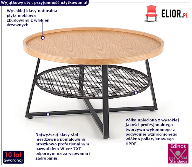 Zaprojektowanie funkcjonalnego mebla, który prezentuje się niebywale to nie wszystko. Ważnym przy tworzeniu wyposażenia do mieszkania jest również wysoka jakość oraz trwałość tak, aby mebel mógł przetrwać wiele lat w jak najlepszym stanie. To osiągnąć można tylko używając najwyższej klasy, sprawdzonych materiałów. Dlatego właśnie firma Elior do wytworzenia blatu ławy Kronos użyła naturalnej płyty meblowej zbudowanej z włókien drzewnych i związków organicznych w warunkach wysokiego ciśnienia i temperatury. Zastosowanie włókien ułożonych sinusoidalnie znacznie zwiększyło jej walory wytrzymałościowe. Dodatkowo płyta została uszlachetniona cienkimi filmami melaminowymi w celu zwiększenia jej trwałości, a brzegi oklejono specjalistycznym materiałem ABS, cechującym się ponadprzeciętną odpornością na zarysowania. Półka upleciona została z wysokiej jakości profesjonalnego tworzywa wykonanego z podwójnie wzmocnionego włókna polietylenowego HPDE o dużej gęstości wzorowanego na rattanie naturalnym. W dodatku jest w pełni ekologiczny i przyjazny środowisku. Nogi stolika wykonane zostały z najwyższej jakości stali nierdzewnej pomalowanej proszkowo odpornym na zarysowania i zadrapania. Technika malowania proszkowego charakteryzuje się dużą trwałością, odpornością na korozję, chemikalia, wysoką temperaturę oraz uszkodzenia mechaniczne, dzięki czemu znacznie podnosi walory użytkowe i estetyczne mebla.
