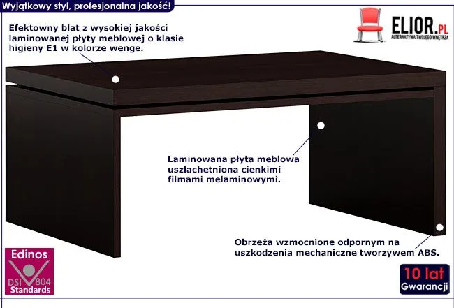 Komfortowa i efektowna ława Emla wyróżnia się nie tylko swoją niebanalną formą i praktycznym kształtem, ale także starannym i dokładnym wykonaniem. To dlatego cieszy się ona powodzeniem wśród osób preferujących profesjonalne rozwiązania. Oryginalna w formie konstrukcja ławy w kolorze wenge wyprodukowana została z najwyższej jakości laminowanej płyty meblowej o klasie higieny E1, uszlachetnionej cienkimi filmami melaminowymi. Posiada także specjalne włókna ułożone różnokierunkowo o strukturze sinusoidalnej, co zapewnia nadanie jej cech jakościowych oraz wytrzymałościowych. Designerski podwójny blat wykonany został ze specjalnej płyty komórkowej, której główną zaletą jest redukcja ciężaru bez utraty stabilności oraz innych funkcji konstrukcyjnych. Dla zwiększenia wytrzymałości i trwałości mebla, obrzeża ławy wykończono odpornym na uszkodzenia mechaniczne tworzywem ABS. Stonowana kolorystyka i prosta forma sprawiają, że stolik kawowy Emla doskonale sprawdza się we wnętrzach urządzonych zarówno w stylu skandynawskim, jak też minimalistycznym czy nowoczesnym. Ława Elior nadaje wnętrzu harmonii i modnego świeżego designu, a każdy łyk kawy przy niej wypity pozwala Ci odetchnąć od codziennego zgiełku i pośpiechu. Nadaj Twojemu wnętrzu wyrazistego designu, harmonizując go ze świeżością naturalnych barw!