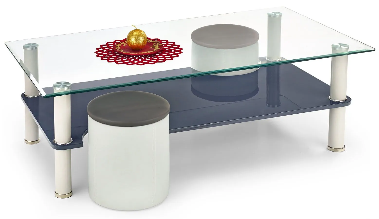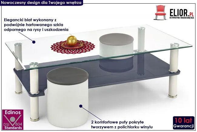 - Materiał: Blat wykonany został z podwójnie hartowanego szkła (odpornego na rysy i zadrapania), a pufy pokryto tworzywem z polichlorku winylu.