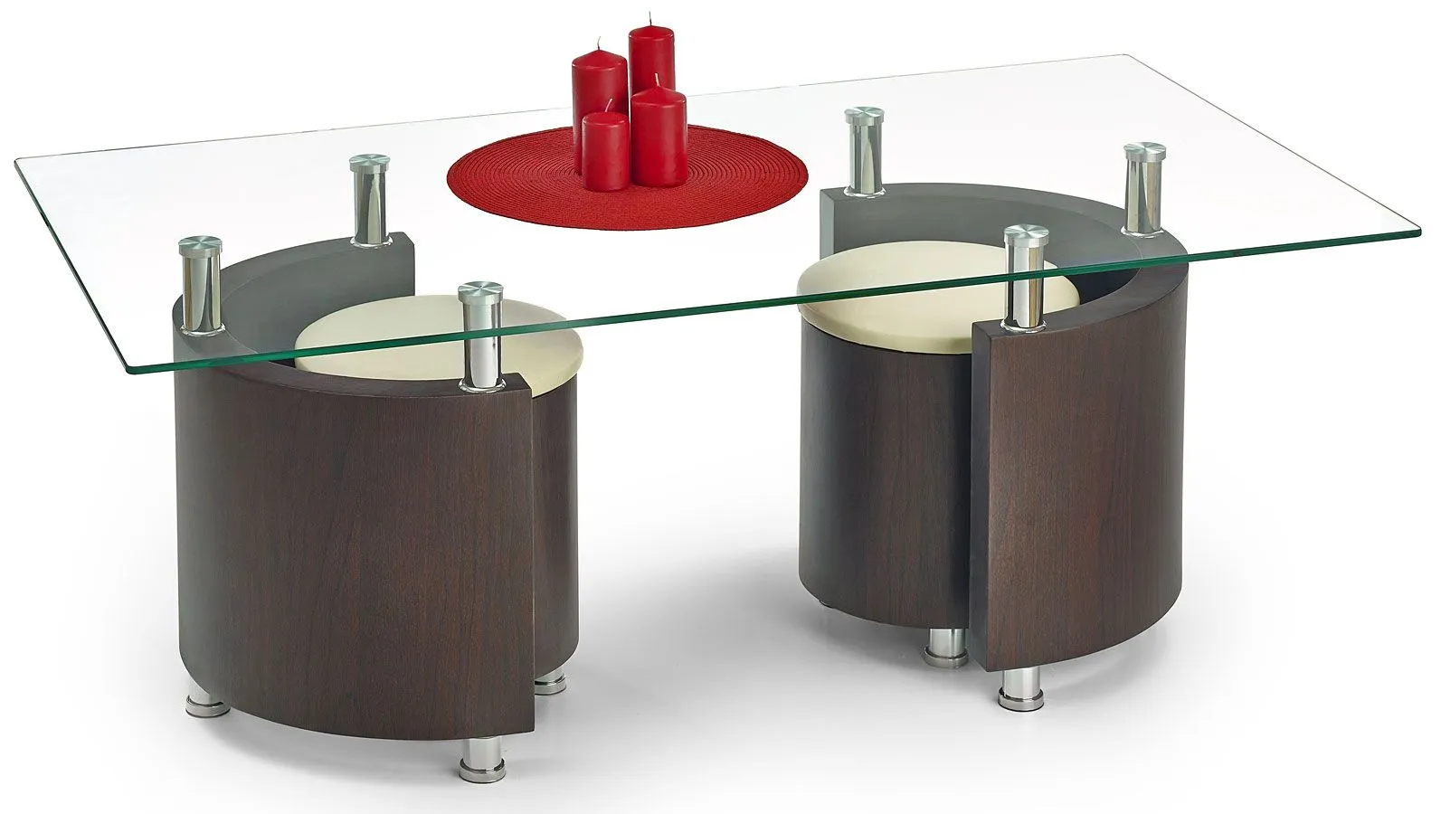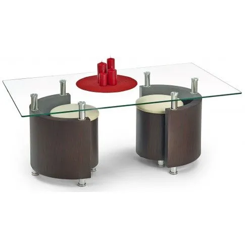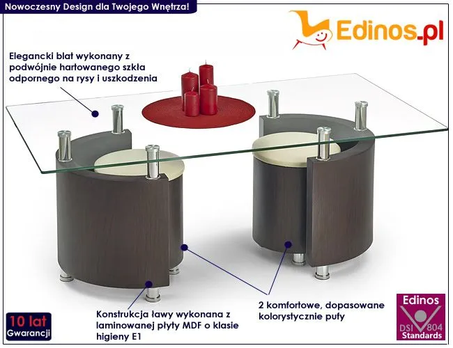 Komfortowa i wykwintna ława Rumo to wyjątkowe przedsięwzięcie młodych europejskich designerów. Wyróżnia się nie tylko swoją praktyczną formą i eleganckim kształtem, ale także zastosowaniem materiałów najlepszej jakości. To dlatego cieszy się ona powodzeniem wśród osób lubiących nowatorskie rozwiązania. Użyta do produkcji stolika płyta laminowana została uszlachetniona cienkimi filmami melaminowymi. Posiada także specjalne włókna ułożone różnokierunkowo, co zapewnia nadanie jej cech jakościowych oraz wytrzymałościowych. Designerski prostokątny blat zrobiono z podwójnie hartowanego szkła, dzięki czemu jest całkowicie odporny na rysy i uszkodzenia. Praktycznym dodatkiem do mebla są dwie wygodne, dopasowane kolorystycznie pufy, które razem tworzą luksusowy zestaw. Ława Rumo dodaje wnętrzu nowoczesności i harmonii, a każda kawa przy niej wypita smakuje wybornie. Podaruj Twoim czterem kątom nieco naturalnego ciepła, harmonizując je ze szlachetnością kolorów ziemi.