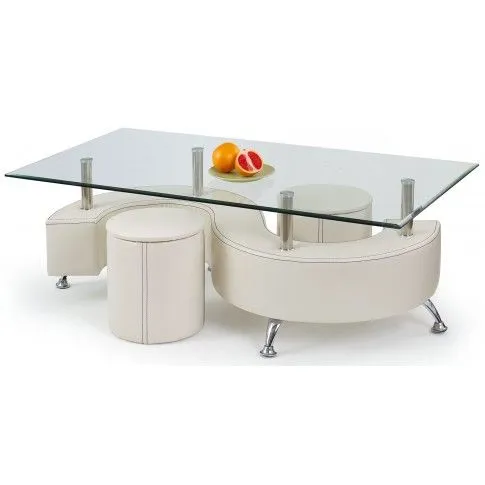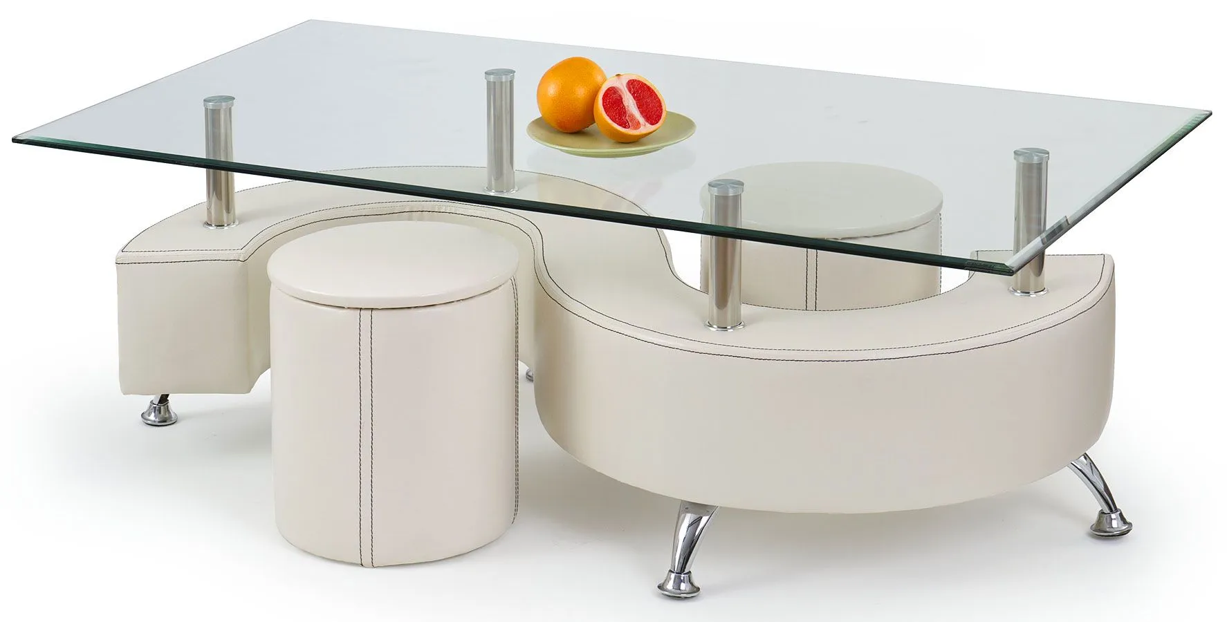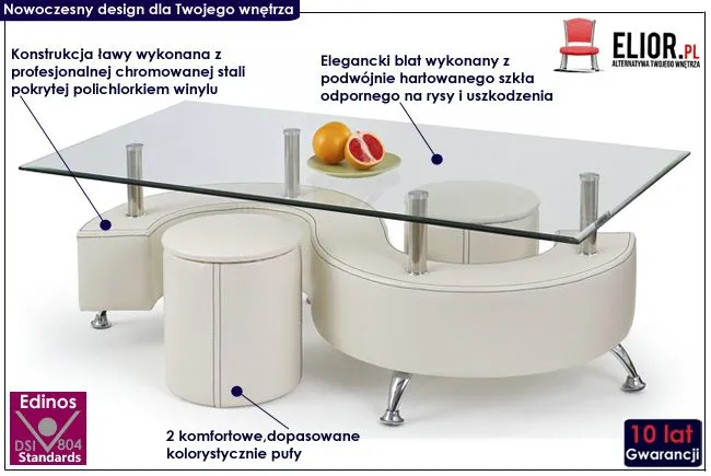 - Materiał: Wysokiej jakości chromowana stal nierdzewna. Blat wykonany został z podwójnie hartowanego szkła (odpornego na rysy i zadrapania), a pufy pokryto tworzywem z polichlorku winylu.