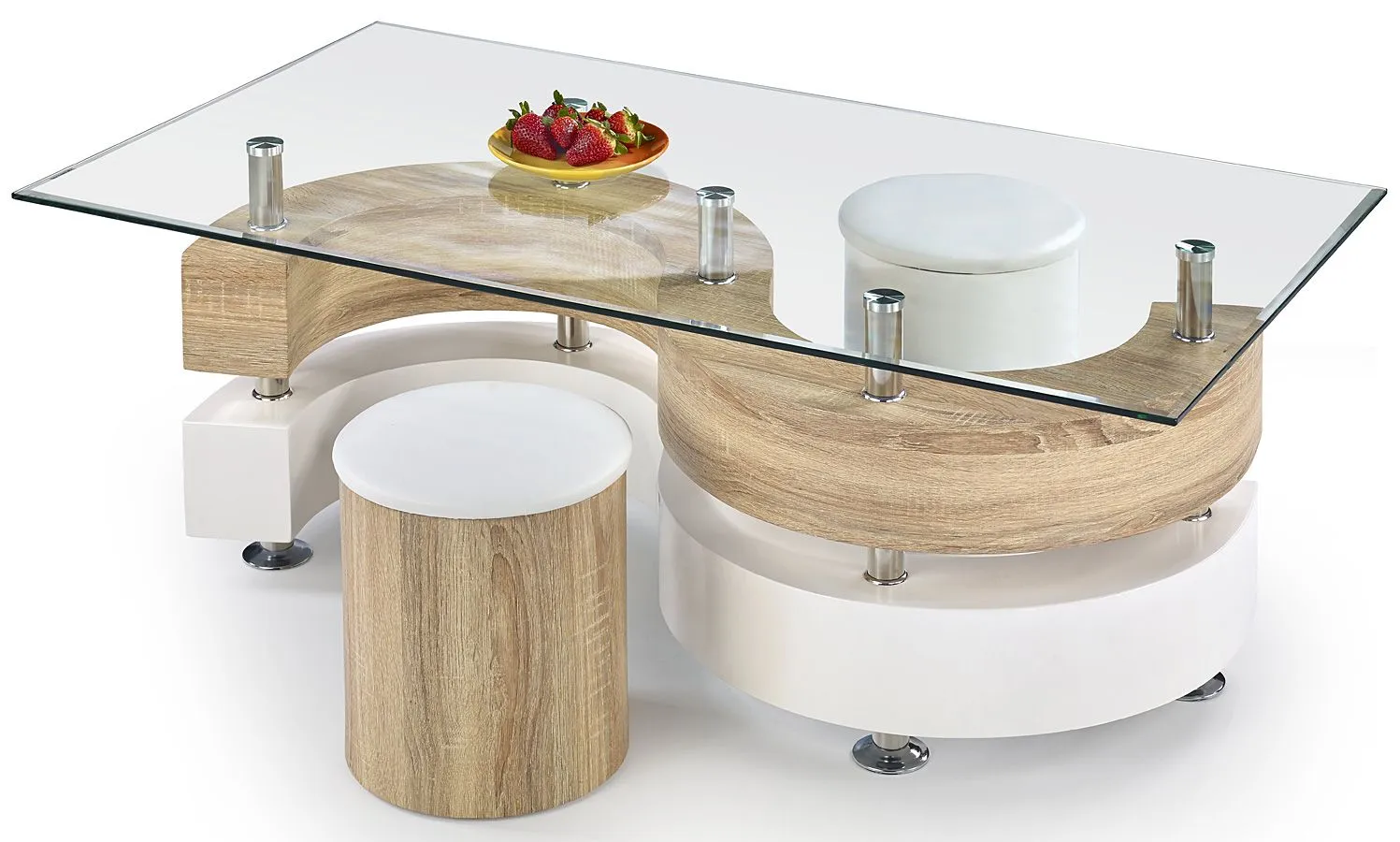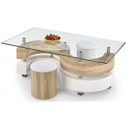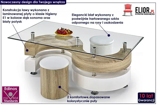 Komfortowa i wykwintna ława Rodi wyróżnia się nie tylko swoją praktyczną formą i eleganckim kształtem, ale także zastosowaniem materiałów najlepszej jakości. To dlatego cieszy się ona powodzeniem wśród osób lubiących nowatorskie rozwiązania. Oryginalna konstrukcja ławy w kształcie litery S wykonana została z wysokiej jakości płyty lakierowanej w kolorze biały połysk oraz płyty laminowanej w kolorze dąb sonoma, uszlachetnionej cienkimi filmami melaminowymi. Posiada także specjalne włókna ułożone różnokierunkowo, co zapewnia jej nadanie cech jakościowych oraz wytrzymałościowych. Designerski blat w prostokątnym kształcie wyprodukowano z podwójnie hartowanego szkła, dzięki czemu jest on całkowicie odporny na rysy i uszkodzenia. Praktycznym dodatkiem do mebla są dwie wygodne, dopasowane kolorystycznie pufy, które razem ze stolikiem tworzą luksusowy zestaw. Zestaw kawowy Rodi dodaje wnętrzu harmonii i elegancji, a każda kawa przy nim wypita smakuje doskonale. Podaruj Twoim czterem kątom nieco naturalnego ciepła, harmonizując je z czystością naturalnych barw.