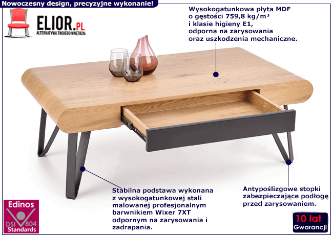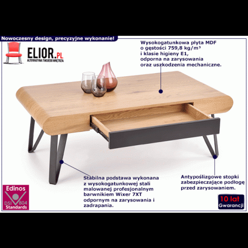 Czy wiesz, że dobrze urządzone wnętrze wpływa na nasze samopoczucie? Dzięki przyjemnie urządzonej kuchni posiłki smakują lepiej, harmonijnie urządzona sypialnia sprawia, że lepiej się wysypiamy, a starannie zaprojektowany kącik relaksu pozwala nam swobodnie wypocząć. Urządzając salon pamiętaj więc, że podstawą jest wygodna sofa oraz komfortowa i designerska ława! Rolia to ława o zgrabnym kształcie i zdecydowanym charakterze - doskonale podkreśli całą aranżację stawiając przysłowiową "kropkę na i". Jej industrialny look sprawi, że Twoje wnętrze nabierze niespotykanego wdzięku i zaskoczy absolutnie każdego kto się w nim pojawi. Ciężki wizualnie blat w kolorze dębu złotego uniesiony został na delikatnych czarnych nóżkach, które sprawiają że całość niezwykle się równoważy i nie przytłacza wnętrza. W blacie umieszczono pojemną szufladę, dzięki której utrzymasz we wnętrzu wymarzony porządek, a irytujący dotąd pilot do telewizora, książka i chusteczki higieniczne znikną pozostawiając nieskazitelnie czysty blat, będąc jednocześnie w zasięgu Twojej ręki. Rolia doskonale odnajdzie się we wnętrzach w stylu industrialnym, nowoczesnym czy też klasycznym. Jej potencjał możesz wykorzystać nie tylko w salonie, ale także biurze, a nawet poczekalni. Ława Rolia jest meblem pełnym niepowtarzanego wdzięku, modernistycznego szyku i doskonałej jakości. Spraw radość sobie i wnętrzu uzupełniając je tym wspaniałym meblem!