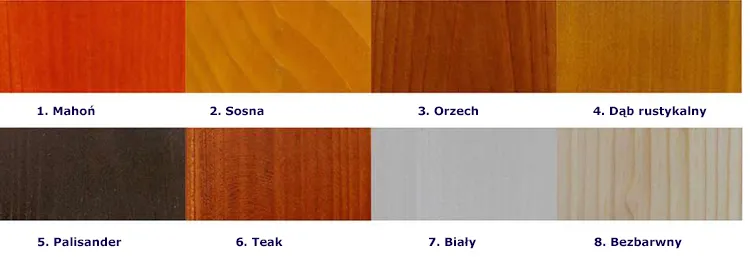- Dostępne do wyboru kolory drewna: sosna, mahoń, dąb rustykalny, biały, teak, orzech, palisander, bezbarwny.