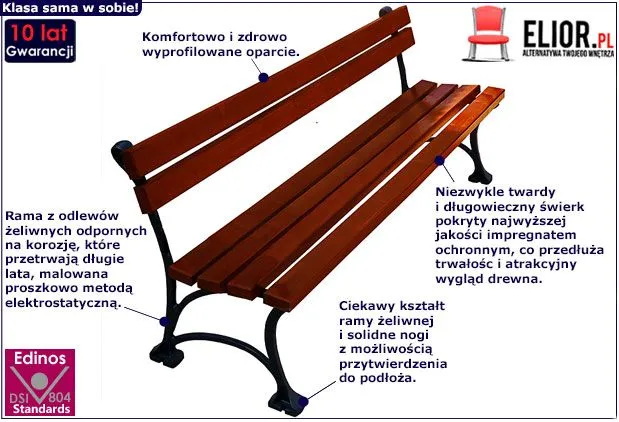 - Materiał: Wysokiej jakości drewno świerkowe, profesjonalny odlew żeliwny odporny na działanie korozji i zmiennych warunków atmosferycznych.