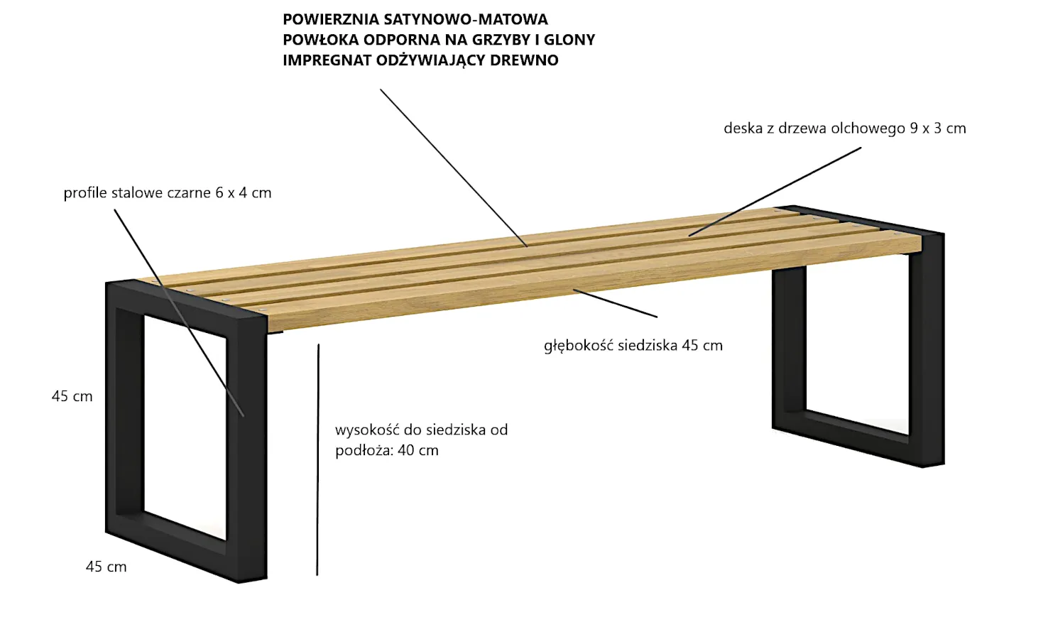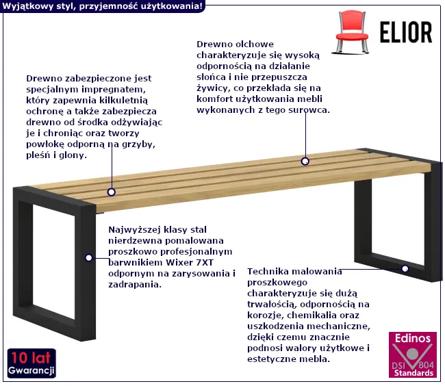 Markę Edinos Premium cechuję skrupulatne dobieranie materiału w trosce o to byś mógł cieszyć się swoimi meblami przez lata. Tak jest też w przypadku ławki Buffales 4X. Jak wiadomo meble ogrodowe są narażone na wiele niesprzyjających czynników, takich jak zmienne warunki atmosferyczne. Dlatego ławka Goździk stworzona została z drewna olchowego, które charakteryzuje się wysoką odpornością na działanie słońca i nie przepuszcza żywicy, co przekłada się na komfort użytkowania mebli wykonanych z tego surowca. Dodatkowymi atutami drewna jest jego antystatyczność i odporność na wilgoć, dzięki czemu nie powstają na nim plamy pleśni i nie rozwijają się bakterie oraz grzyby. Konstrukcja mebla została stworzona ze stali nierdzewnej pomalowanej proszkowo metodą elektrostatyczną. Dzięki temu mebel jest odporny na zarysowania i zadrapania. Najwyższa jakość techniki metody natrysku proszkowego pozwoliła zaoferować marce Edinos Premium aż 10 lat gwar. na swoje produkty. Technika malowania proszkowego charakteryzuje się dużą trwałością, odpornością na korozje, chemikalia oraz uszkodzenia mechaniczne, dzięki czemu znacznie podnosi walory użytkowe i estetyczne mebla. Całość zabezpieczona jest specjalnym impregnatem, który zapewnia kilkuletnią ochronę a także zabezpiecza drewno od środka odżywiając je i chroniąc oraz tworzy powłokę odporną na grzyby, pleśń i glony.