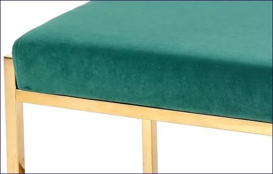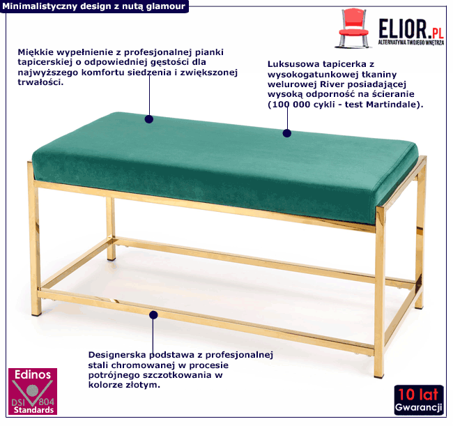 Ławka Alerko marki Elior zaprojektowana została z zastosowaniem materiałów najlepszej jakości. Designerska tapicerka postała z wysokogatunkowej tkaniny River - to gęsta i aksamitna tkanina obiciowa typu velvet. Materiał ten jest niesamowicie miękki i aksamitny w dotyku, a głęboki odcień zieleni dodaje całości szyku i subtelnej elegancji. River to jeden z francuskich welurów posiadający bardzo dobrą odporność na ścieranie (do 100 000 cykli - test Martindale). Już nie musisz się martwić, że rozlana kawa spowoduje konieczność wymiany mebla. Bogatą strukturę tapicerki wyśmienicie podkreśla designerska podstawa w minimalistycznym stylu. Podstawa została zaprojektowana i wykonana z najwyższej jakości profesjonalnej stali w złotym kolorze. Stal poddano procesowi profesjonalnego chromowania, dzięki czemu uzyskała znacznie większą trwałość, odporność na korozję, chemikalia, wysoką temperaturę oraz uszkodzenia mechaniczne niż produkty konkurencji. Zastosowanie tych odpornych na uszkodzenia materiałów znacząco wydłuża czas eksploatacji mebla, co pozwoli Ci cieszyć się jego wyjątkowym komfortem i klasyczną urodą przez długie lata. Potrzebujesz świeżego akcentu w swoim wnętrzu? Postaw na najnowszy projekt marki Elior. Nie uwierzysz jak fantastycznie urządzisz swoje wnętrze z ławką Alerko.