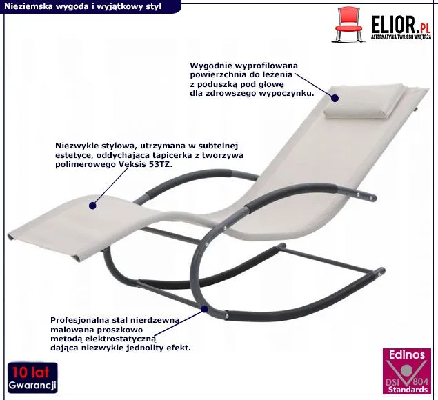 Przemyślana konstrukcja leżaka Lamar marki Elior pozwala na delikatne, relaksujące bujanie się. Wytrzymała stal nierdzewna malowana proszkowo metodą elektrostatyczną to spełniona obietnica długotrwałego użytkowania bez jakiegokolwiek uszczerbku dla wyglądu i fizycznego stanu mebla. Leżak poradzi sobie wspaniale z obciążeniem aż do 150 kg, dlatego będziesz się czuć na nim stabilnie i bezpiecznie. Poszycie, mimo aury delikatności, jest wykonane z porządnej, nierozciągliwej i łatwoczyszczącej tkaniny polimerowej Veksis 53TZ. Pomyśleliśmy też o zwiększeniu komfortu i walorów zdrowotnych związanych z użytkowaniem naszego leżaka, dodając poduszkę pod głowę – nie będziesz więcej czuć dyskomfortu z racji braku podparcia w tym newralgicznym miejscu.