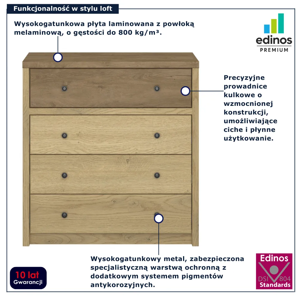 Komoda Sevisso 4X marki Edinos Premium została zaprojektowana tak, aby uporządkować codzienność w pokoju młodzieżowym lub salonie, jednocześnie nadając przestrzeni loftowego charakteru. Jej cztery praktyczne szuflady pozwalają wygodnie posegregować rzeczy, a różnicowanie ich wykończenia tworzy ciekawy, kontrastowy efekt. Stabilna bryła podkreśla nowoczesny styl kolekcji, a metalowe uchwyty stanowią wyrazisty akcent, który nadaje całości industrialnej osobowości. To komoda, która nie tylko świetnie organizuje przestrzeń, ale także wizualnie ociepla pomieszczenie, zachowując przy tym nowoczesny charakter.
