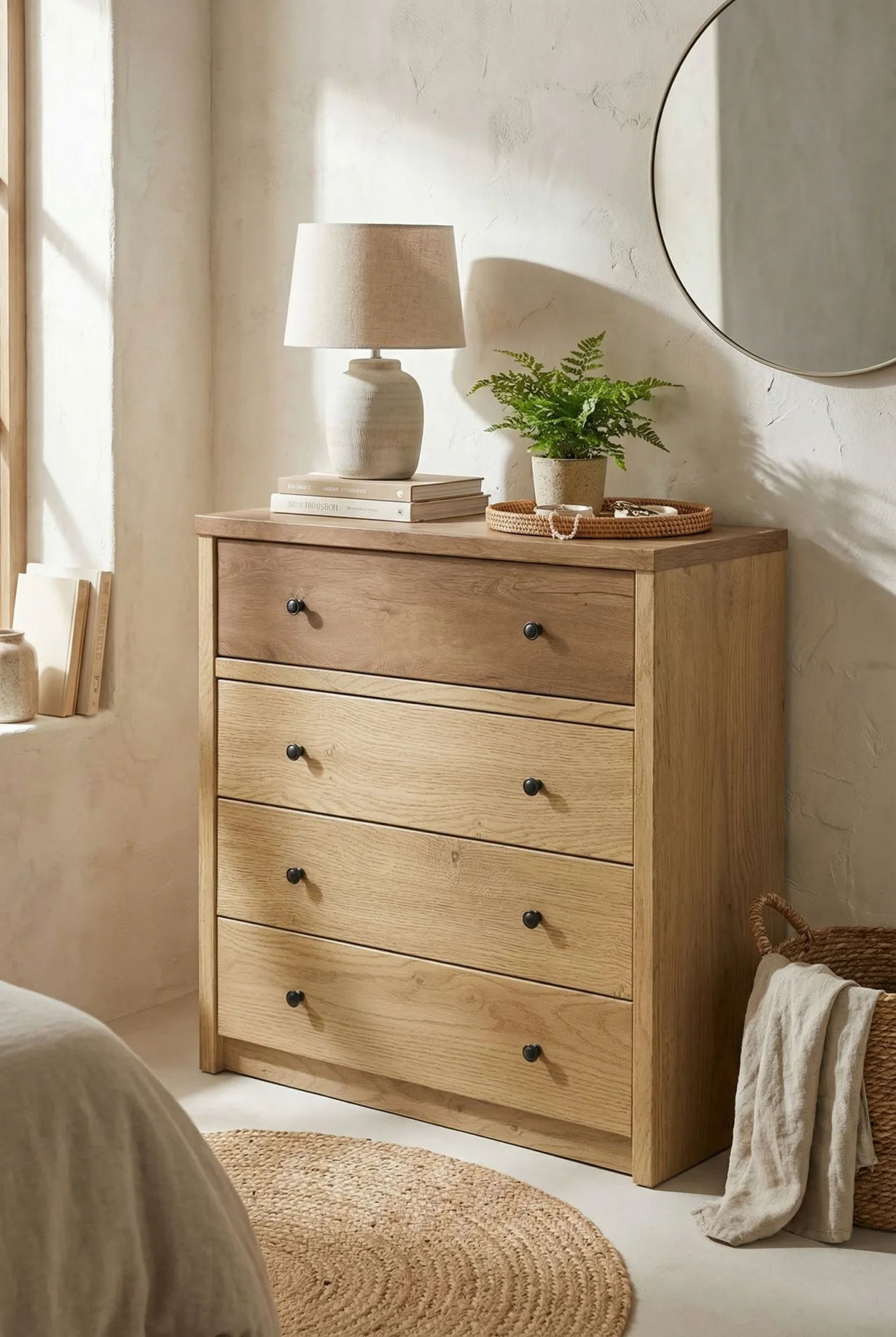 Komoda świetnie wpasowała się w moje wnętrze, zwłaszcza dzięki połączeniu dwóch kolorów dębu, które wyglądają bardzo naturalnie i elegancko. Szuflady wysuwają się płynnie, mają dobrą pojemność i nic się nie zacina. Paczka była dobrze zabezpieczona, a montaż poszedł sprawnie, nawet w pojedynkę. Całość prezentuje się solidnie i sprawia wrażenie naprawdę trwałego mebla. Jestem bardzo zadowolona z zakupu.
