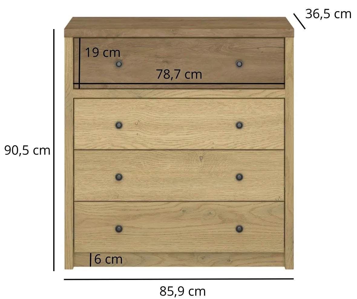 Bardzo praktyczna komoda, szuflady mieszczą sporo rzeczy. Wszystko działa bezproblemowo, a mebel wygląda elegancko. Odcień dębu świetnie pasuje do mojego pokoju. Zakup bardzo udany zrobiłbym go ponownie.