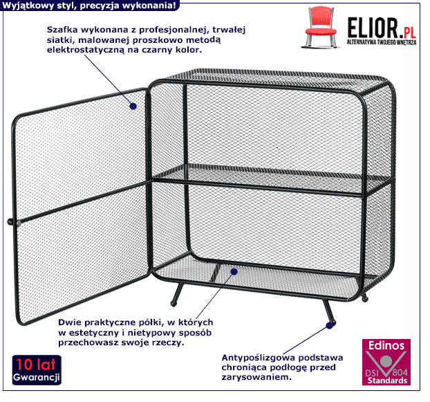 Pomysłowo i ciekawie zaprojektowana szafka Dundi jest meblem cechującym się ciekawą, ale i uniwersalną formą. Jest to zasługa między innymi starannie dobranych i niezwykle trwałych materiałów meblarskich. Dzięki nim stylową szafkę użytkuje się naprawdę wygodnie, przyjemnie i co istotne – bez uszkodzeń przez wiele lat. Do produkcji industrialnej szafki Dundi wykorzystano poddany specjalistycznej obróbce, nowoczesny surowiec. Jest to profesjonalna, wysokogatunkowa i wytrzymała siatka, malowana proszkowo metodą elektrostatyczną, odporna na zniekształcenia i rysy. Zapewnia ona dwie rzeczy jednocześnie - wyjątkową trwałość oraz jakże praktyczną lekkość mebla. Dzięki temu szafkę Dundi można dowolnie przenosić i przesuwać. To bardzo istotne, by meble, w które inwestujemy, cechowało wytrzymałe, staranne wykonanie. Na szczęście z modną szafką Dundi nie trzeba się o to martwić! Ten pełen modernistycznego, a przy tym interesującego charakteru mebel wciąż cieszy oko niebywałym wdziękiem. Czarna szafka Dundi posiada bezsprzecznie wiele zalet – trwałość, stabilność, dokładne wykonanie, funkcjonalizm i oczywiście świeżą, pełną pomysłowości prezencję. Chyba każdy przyzna, że warto mieć tak ekstrawagancki i funkcjonalny mebel w swoich starannie i przemyślanie zaaranżowanych i wypielęgnowanych stylowo przestrzeniach.