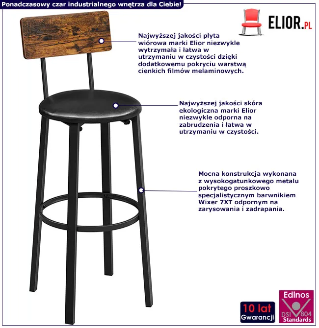 Zestaw taboretów barowych Paron wykonano z wykorzystaniem najwyższej jakości płyty wiórowej marki Edinos Premium niezwykle odpornej na uszkodzenia mechaniczne. Mocną metalową konstrukcję z wysokogatunkowego metalu pokryto proszkowo specjalistycznym odpornym na zarysowania i zadrapania. Siedzisko z świetnej skóry ekologicznej marki Edinos Premium jest niezwykle trwałe. Nie musisz obawiać się żadnych odbarwień a plamy zejdą z łatwością. Wybierz ponadczasowy styl industrialny i ciesz się modnym wnętrzem z zestawem 2 hokerów Paron marki Edinos Premium.