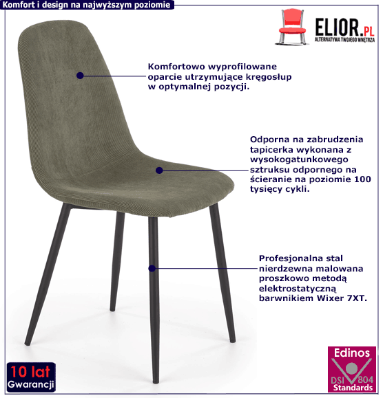 Wbrew pozorom minimalistyczne krzesła wymagają niezwykle ciężkiej pracy, aby mogły zachwycać tak niezwykłym i czarującym designem. Krzesła Mavo powstawały pod okiem najlepszych projektantów, designerów i inżynierów marki Elior. Dzieło tak doskonałe w swojej prostocie to połączenie solidnych i trwałych surowców, które najpierw zostały wyselekcjonowane spośród wielu innych. Aby krzesło wyróżniało się nieprawdopodobną wytrzymałością do jego konstrukcji użyta została profesjonalna stal nierdzewna. To mocny i stabilny materiał gwarantujący długie użytkowanie. Stal pomalowano metodą proszkową , wykorzystując nowoczesną technikę elektrostatyczną. Dzięki temu mebel wyróżnia się niezwykłą odpornością na chemikalia, korozje i uszkodzenia mechaniczne. Przytulna tapicerka krzesła Mavo to wysokogatunkowy, bardzo ceniony i wiecznie modny sztruks. Jest jedną z najlepszych tkanin obiciowych, gdyż cechuje się wysoką wytrzymałością i dużą odpornością na ścieranie - 100 tysięcy cykli. Delikatne mikrowłoski na materiale sprawiają, że sztruks jest niesamowicie przyjemny w dotyku. Podnosi to też walory estetyczne mebla, wprowadzając ciepły i przytulny klimat. Całość wykonana została z olbrzymią precyzją, dzięki której krzesło prezentuje się nieskazitelnie. Przekonaj się już dziś, ile dobrego wniesie do Twojej codzienności.