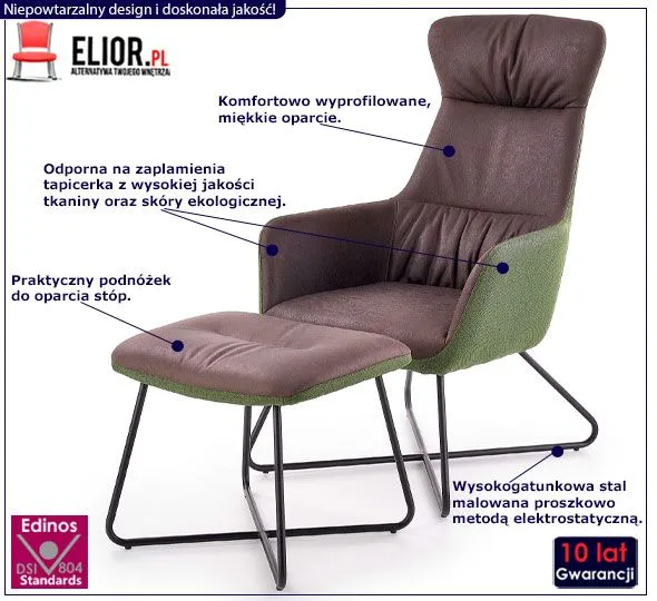 Styl industrialny stał się ostatnio bardzo popularny. Charakteryzuje go surowość wnętrz oraz uboga paleta kolorystyczna połączona z metalem. Nawiązuje on do dawnych wnętrz przemysłowych, są to fabryki przerobione na mieszkania. Wiele osób styl loftowy kojarzy z bardzo surowym wnętrzem, w którym panuje chłód i brakuje przytulności, jednak da się urządzić wnętrze w stylu industrialnym gdzie panować będzie ciepła atmosfera. Za sprawą odpowiednich dodatków, bez problemu urządzisz przytulne loftowe wnętrze. Fotel wypoczynkowy to idealny mebel który podkreśli charakter wnętrza, a przy okazji zadba o Twoje zdrowie i pozwoli swobodnie zrelaksować się zapominając o otaczającym Cię świecie. Marzysz o wieczorze tylko dla siebie z ulubioną książką lub filmem? Z fotelem Debos jest to możliwe! Minimalizm to podstawa stylu industrialnego dlatego wbierz prosty, wygodny fotel, zapewniający maksymalny komfort. Debos to designerski fotel z podnóżkiem w odcieniach intrygującej ciemnej popieli w połączeniu z ciemną zielenią. Pozycja w której siadamy korzystając z podnóżka poprawia nam krążenie krwi, a doskonale wyprofilowane oparcie dba o kręgosłup. Fakt, że podnóżek nie jest połączony z fotelem to dodatkowy atut, ponieważ dwie części fotela możesz wykorzystać jako dodatkowe miejsca dla niespodziewanych gości. Jesteśmy pewni, że ten niezwykle wygodny, nowoczesny fotel urzeknie Cię swoją wygodą i sprawi, że nie będziesz miał ochoty z niego wstawać!