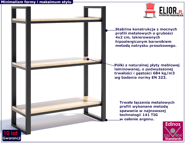 Regał Glurox 2X to wyjątkowy projekt stworzony z myślą o osobach oczekujących od mebli wieloletniej trwałości, najwyższej jakości komponentów bezpiecznych dla zdrowia oraz nieszablonowego designu. Glurox 2X wyróżnia się surową zgeometryzowaną formą oraz o najwyższych parametrach technicznych. Mocne i wytrzymałe półki wyprodukowano z profesjonalnej płyty meblowej laminowanej o podwyższonej trwałości i gęstości. Naturalna płyta meblowa o klasie higieny E1 zbudowana została z włókien drzewnych i związków organicznych w warunkach wysokiego ciśnienia i temperatury. Dodatkowo uszlachetniono ją cienkimi filmami melaminowymi, by zwiększyć jej trwałość. Włókna melaminowe ułożone są różnokierunkowo, o strukturze sinusoidalnej, co zapewnia nadanie jej cech jakościowych oraz wytrzymałościowych. Konstrukcja regału wykonana została ze szlachetnego metalu nierdzewnego lakierowanego proszkowo profesjonalnym barwnikiem odpornym na zarysowania i zadrapania. Najwyższa jakość techniki metody natrysku proszkowego pozwoliła zaoferować firmie Elior aż 10 lat gwar. na swoje produkty. Technika malowania proszkowego charakteryzuje się dużą trwałością, odpornością na korozję, chemikalia, wysoką temperaturę oraz uszkodzenia mechaniczne, dzięki czemu znacznie podnosi walory użytkowe i estetyczne mebla. Trwałe łączenia metalowych profili zostały wykonane metodą spawania w najnowszej technologii 141 TIG w osłonie argonu, co zapewnia stabilność mebla i bezpieczeństwo użytkowania. Najwyższa jakość nowoczesnych materiałów, doskonały projekt oraz precyzyjne wykonanie tworzą mebel o wybitnych walorach użytkowych i dekoracyjnych. Dodatkowym atutem Glurox 2X jest nieprzeciętna łatwość w utrzymaniu. Dzięki ażurowej konstrukcji, otwartym półkom i wysokim nóżkom możliwość gromadzenia kurzu jest ograniczona do minimum, co jest niezwykle istotne dla osób uczulonych i alergików. Mebel wystarczy przetrzeć wilgotną ściereczką i wytrzeć do sucha, by cieszyć się jego urodą przez długie lata. Nie szukaj dłużej idealnego mebla dla siebie. Właśnie znalazłeś! To regał Glurox 2X marki Elior. Zamów ten bezbłędny regał i rozkoszuj się nową jakością swojego wnętrza już dziś.