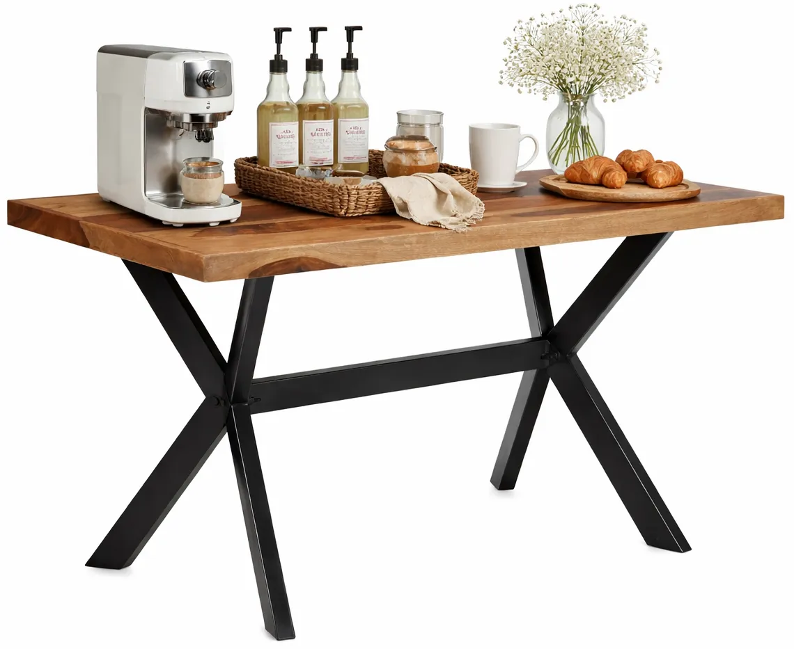 Stół jadalniany jest nieodłącznym elementem każdego domu, przy którym spędzasz czas, jedząc codzienne posiłki lub świętując ważne chwile ze swoimi bliskimi i przyjaciółmi. Dlatego też blat mebla marki Edinos Premium jest wykonany z drewna sheesham, które słynie ze swojej odporności na czynniki zewnętrzne, twardości, zwartości, jak i skutki codziennego użytkowania, na przykład ścieranie. Stalowe nogi z ramą krzyżową, które wieńczą stół, są natomiast na tyle mocne i stabilne, że nie istnieje ryzyko przewrócenia się lub zachwiania mebla.