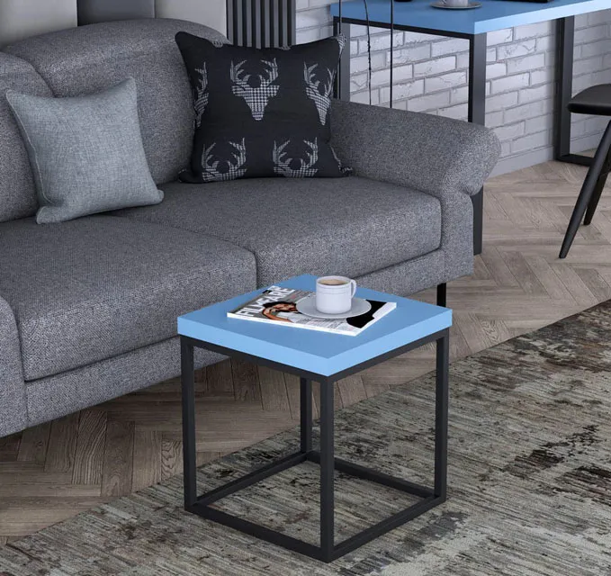 Poniżej przedstawiamy Ci przykładowe wnętrze z zastosowaniem stolika kawowego Eureka w kolorze niebieskim: