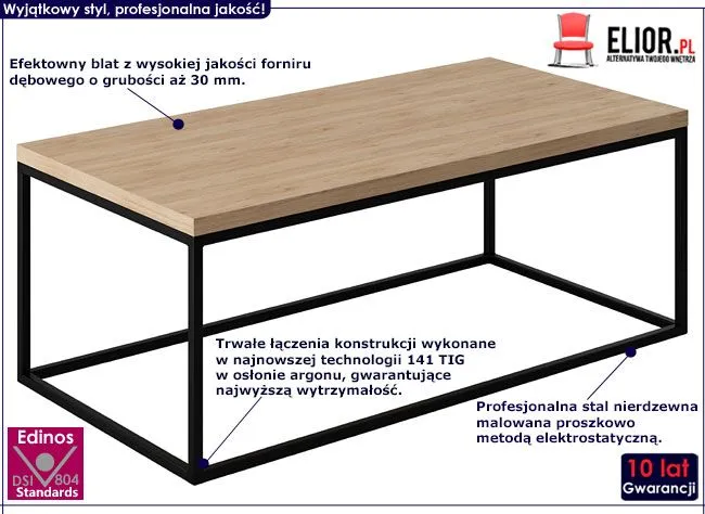 Komfortowy prostokątny stolik loftowy Landu 4X wyróżnia się nie tylko swoją niebanalną formą i praktycznym kształtem, ale także starannym i dokładnym wykonaniem. To dlatego cieszy się on powodzeniem wśród osób preferujących niebanalne rozwiązania i szybko zyskał status bestsellera. Efektowny drewniany blat o grubości aż 30 mm wykończono najwyższej jakości fornirem dębowym. Fornir jest znakomitą alternatywą dla litego drewna, gdyż zachowuje jego fakturę i szlachetny wygląd, przy jednoczesnym wyeliminowaniu typowych wad, takich jak skrzypienie, wypaczanie czy odkształcanie. Fornir używany przy produkcji mebli marki Elior jest o 28% bardziej odporny na uszkodzenia mechaniczne i kontakt z wodą od tańszej laminowanej okleiny, dzięki temu mebel przez długi czas zachowuje pożądany wygląd i nie ulega zniszczeniu. Czarna konstrukcja stolika wykonana jest w całości z najlepszej jakości stali wysokowęglowej, dzięki czemu profil mebla posiada nawet o 46% lepszą wytrzymałość na rozciąganie oraz twardość . Stal używana do produkcji mebli Elior, została hartowana podwójnie przez proces szybkiego chłodzenia aż do temperatury końca przemiany martenzytycznej, a nie tylko do temperatury otoczenia tak jak w większości podobnych procesów. Elementy konstrukcyjne stolika zostały połączone ze sobą metodą spawania 141 tig w osłonie argonu o średnicy elektrody 0,6 mm, co jeszcze raz podkreśla ich wytrzymałość, jak również nieprzeciętne walory estetyczne.