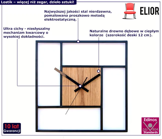 • Kwadratowy kształt nadaje zegarem nowoczesnego charakteru.