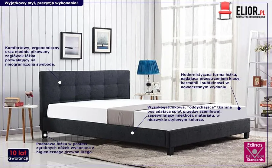 Świetne łóżko Dalton zostało zaprojektowane z wysokogatunkowej, „oddychającej” tkaniny, która została wzmocniona przędzą szenilową. Tkanina posiada szlachetne ultramikrowłókna, dzięki czemu cechuje się wyjątkową miękkością oraz gładkością w dotyku. Ponadto profesjonalna tkanina cechuje się odpornością na ścieranie, a jej odpowiednia struktura została wykonana według najnowszych technologii zapobiegających zabrudzeniom. Świetna podstawa łóżka Dalton to naturalne, w pełni higieniczne drewno lite posiadające właściwości antystatyczne. Zapewnia ono stabilność i trwałość całej konstrukcji mebla. Na drewnie litym kurz łatwo nie osiada, a więc jest to znakomita propozycja dla alergików. Dalton to łóżko wykonane w innowacyjnej, modernistycznej kolorystyce, która zachwyca już od progu. Tkanina to wyjątkowy, niezwykle gustowny ciemny popiel kolor, który został dopełniony ponadczasową, drewnianą podstawą. Ta stylowa podstawa – kwadratowe nóżki – nadaje meblowi lekkości i wdzięku. Takie kolorystyczne rozwiązanie znakomicie odnajdzie się w nowoczesnych przestrzeniach, w których panuje harmonia i wyrafinowany styl. Wyszukane barwy mebla sprawiają, że sypialnia nabiera świeżego, pełnego werwy charakteru. Duży zagłówek oraz wyjątkowa miękkość obicia łóżka pozwalają na swobodę, wyjątkowy relaks i po prostu nieograniczoną wygodę. Komfortowe łóżko Dalton zapewni Ci zarówno chwile upragnionego wypoczynku w samotności, jak i niezapomniane chwile z bliską osobą.