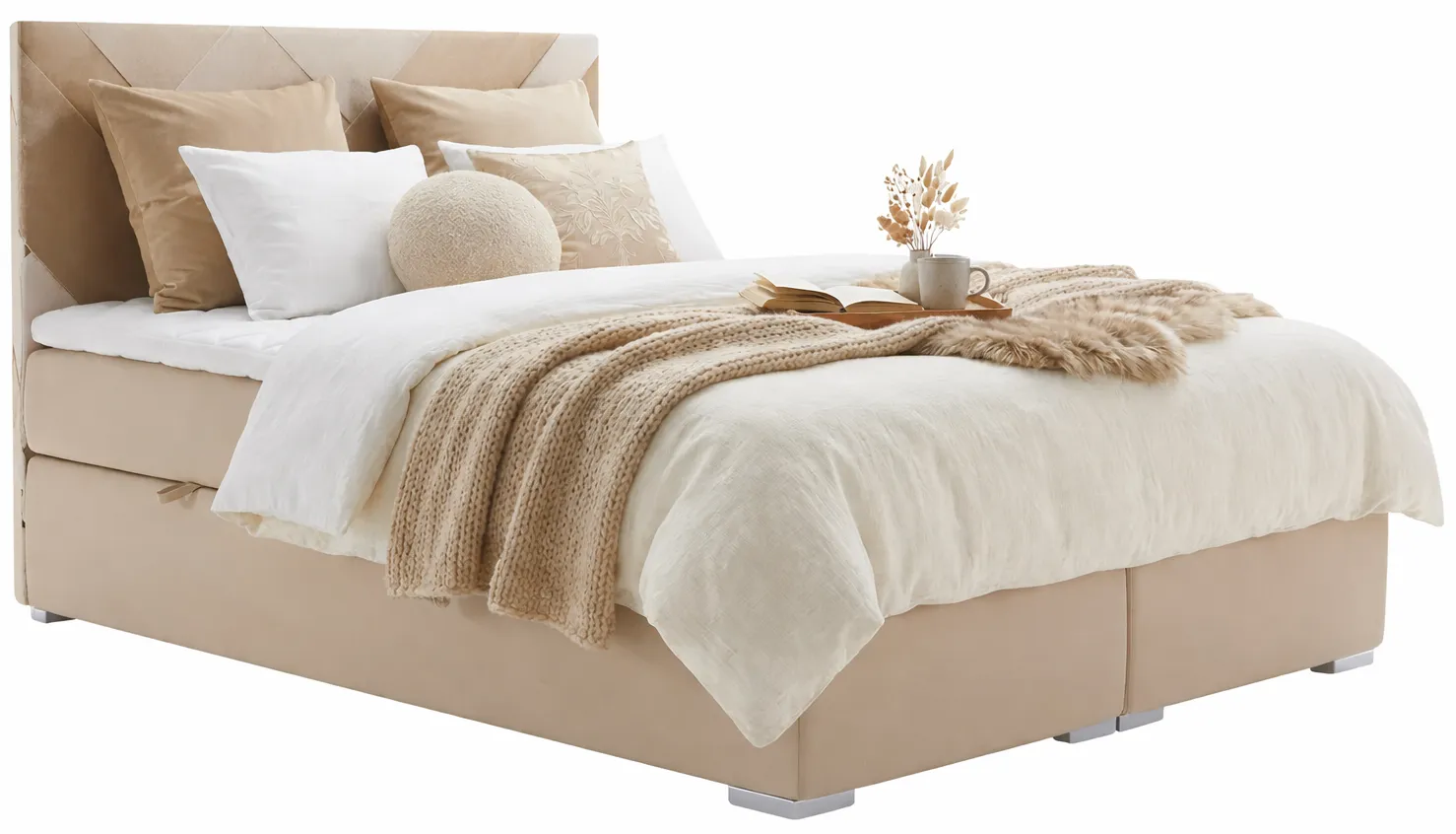 Kontynentalne łóżko typu boxspring Murowis marki Edinos Premium to luksusowy model zaprojektowany i stworzony z najwyższej jakości materiałów o doskonałych parametrach technicznych i wytrzymałościowych. Jego podstawę stanowi solidna skrzynia z drewna naturalnego oraz płyty meblowej o klasie higieny A1. Naturalna płyta meblowa to trwały materiał zbudowany z włókien drzewnych i związków organicznych w warunkach wysokiego ciśnienia i temperatury. Włókna o strukturze sinusoidalnej ułożone są różnokierunkowo, co podnosi jej parametry wytrzymałościowe i jakościowe. Dodatkowo płyta została uszlachetniona cienkimi filmami melaminowymi w celu zwiększenia jej trwałości. Łóżko Murowis zostało wyposażone w wygodny podwójny pojemnik na pościel z aurtomatami wspomagającymi otwieranie, dzięki czemu bez problemu zachowasz ład i porządek w sypialni. Na skrzyni opiera się wysoki na 20 cm materac bonellowy z funkcją cyrkulacji powietrza, obłożony pianką o optymalnej dla kręgosłupa gęstości T25. Materac bazowy uzupełnia Topper - materac nawierzchniowy wykonany z termoelastycznej pianki Visco Memory z funkcją pamięci. Pianka Visco Memory pod wpływem ciepła staje się bardzo plastyczna, dzięki czemu idealnie dopasowuje się do ciała, rozluźnia mięśnie oraz przdeciwdziała ich skurczom. Wypoczynek na materacu z pianki Visco ma pozytywny wpływ na poprawę krążenia, co jest szczególnie istotne dla zdrowia osób starszych i z dolegliwościami kręgosłupa. Konstrukcja wkładu zapewnia optymalną dla kręgosłupa twardość powierzchni, odpowiednią przepuszczalność powietrza i wygodę podczas odpoczynku. Miękki wysoki zagłówek, poza funkcją dekoracyjną stanowi ochronę ściany przed zabrudzeniem oraz niezwykle komfortowe oparcie dla pleców. Masz dość nieprzespanych nocy? Nawet poranna kawa ratuje sytuacji, kiedy budzisz się z bólem pleców? Potrzebujesz czegoś specjalnego! Kontynentalne łóżko Lefka marki Edinos Premium zapewni Ci idealny komfort podczas snu i wspaniale urządzi Twoją sypialnię.