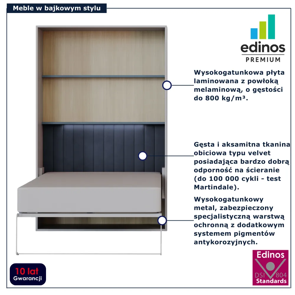 • Produkt posiada certyfikat jakości "Edinos Standards DSI 804", który potwierdza najwyższą jakość wykonania mebla oraz pełny stopień zgodności poszczególnych jednostek wytworzonego wyrobu z przyjętym wzorcem.