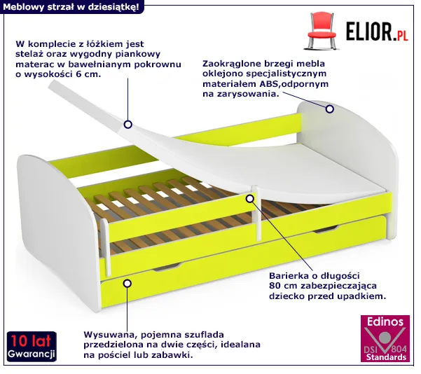 - Kolor: biały + limonka. Kliknij w link i sprawdź także inne łóżka dziecięce w sklepie Edinos.pl. Stwórz swój praktyczny zestaw mebli.