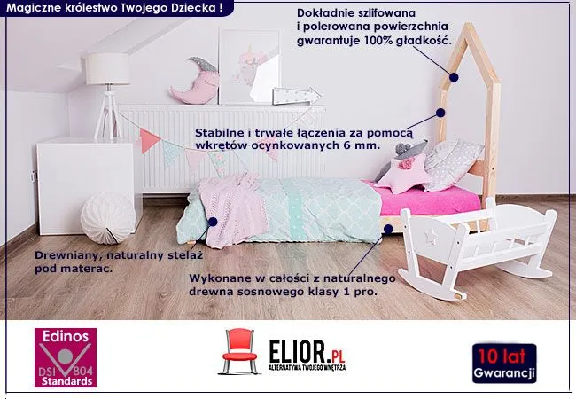Łóżko to najważniejszy mebel każdego z nas. Mebel, z którym spędzamy minimum 1/3 życia. Zadbaj więc o to, aby właśnie łóżko Twojego dziecka prezentowało się magicznie i naprawdę wyjątkowo, gwarantując przy tym jakże potrzebny, zdrowy oraz bezpieczny sen. Łóżko domek Dalli 12X marki Elior, wykonane zostało w całości z naturalnego i prawdziwego drewna sosnowego. Dokładnie szlifowana powierzchnia materiału poddana została dodatkowo zabiegom poleryzacji, aby jeszcze dokładniej oddać gładkość naturalnego drewna. Dzięki tym zabiegom łóżko Miles nie jest zabezpieczane już żadnym chemicznymi środkami ochronnymi do drewna (lakiery, lakierobejce itp), które nie są obojętne na kontakt ze skórą. Łóżko dziecięce Dalli 12X to 100% natury w najlepszym wydaniu dla Twojego dziecka.