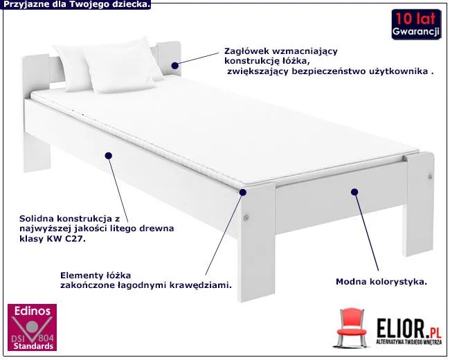 W idealnym świecie potrzebny jest solidny przyjaciel. Czy łóżko Ottav może nim zostać? Oczywiście. Polskie, lite drewno sosnowe, to nie byle jaka sklejka z chińskiego importu. To materiał sprawdzony i pewny. Dopasujesz je do charakteru swojego dziecka wybierając odpowiedni kolor: biały, jasno szary, ciemno-szary, czarny, czy naturalny zaimpregnowany( dla miłośników koloru mamy możliwość wybarwienia w kolorze niebieskim bądź różowym). Stelaż łóżka złożony jest z czternastu desek, wzmocniony konstrukcyjną listwą środkową i dodatkową nogą, co bezpośrednio przekłada się na zwiększone bezpieczeństwo i komfort podczas spania jak również zabawy. Kolejnym elementem wpływającym na wysoką jakość łóżka Ottav jest solidny zagłówek, który ochroni zarówno zwiercone dusze przed niepotrzebnymi guzami, jak i ścianę przed wycieraniem lub uszkodzeniami. I wreszcie to, co zawsze przekonuje rodziców przy wyborze łóżka –jego łagodne, zaokrąglone brzegi i krawędzie. Nie oszukujmy się, brak ostrych kantów uchroni zarówno małego użytkownika przed obiciami, otarciami czy nawet rozcięciem skóry, jak i ukochaną osobę, która czyta książki i dba o porządek na co dzień. Podsumujmy przyjazne cechy łóżka Ivorin: wykonanie z naturalnego drewna, bezpieczeństwo, funkcjonalność, wysoki komfort, ustawność, piękna kolorystyka.
