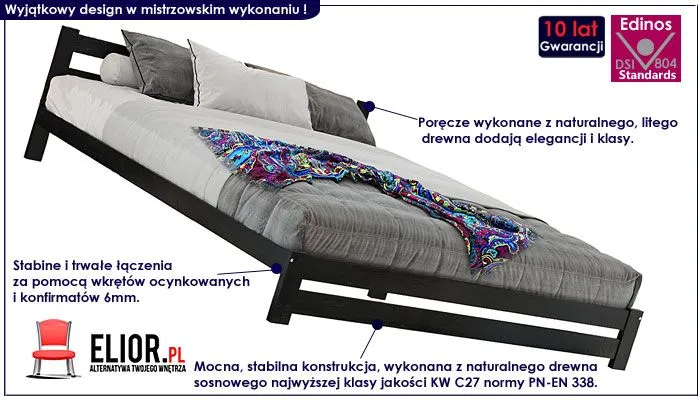 Łóżko Gersa wyróżnia się nie tylko swoją bajeczną formą oraz wyjątkową wygodą, ale także zastosowaniem materiałów najlepszej jakości. To dlatego cieszy się powodzeniem wśród osób lubiących ciekawe rozwiązania. Konstrukcja mebla wykonana została z najwyższej jakości naturalnego drewna wg normy PN-EN 338 barwionego w kolorze czarnym, gwarantując najgłębsze nasycenie barwy i mistrzostwo stylu. Filary oraz poręcze wykonane z naturalnego, litego drewna dodają elegancji i wyjątkowego stylu. Niebywały, porywający i minimalistyczny design bez zbędnego przerostu formy na treścią, połączony z niezwykłą funkcjonalnością - tak właśnie prezentuje się najnowsze łóżko Gersa marki Elior.