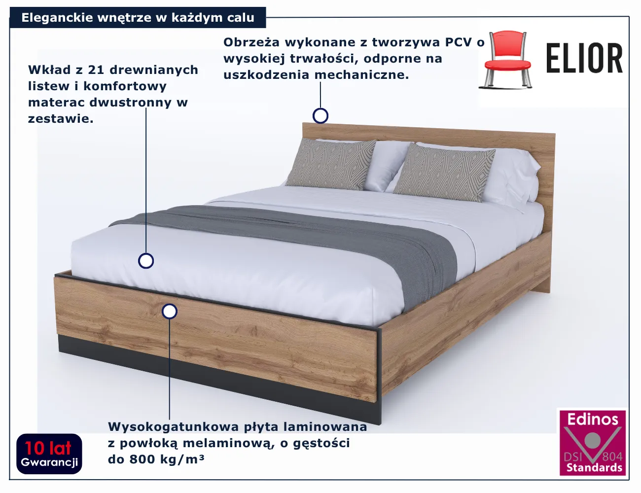 • Produkt posiada certyfikat jakości "Edinos Standards DSI 804", który potwierdza najwyższą jakość wykonania mebla oraz pełny stopień zgodności poszczególnych jednostek wytworzonego wyrobu z przyjętym wzorcem.
