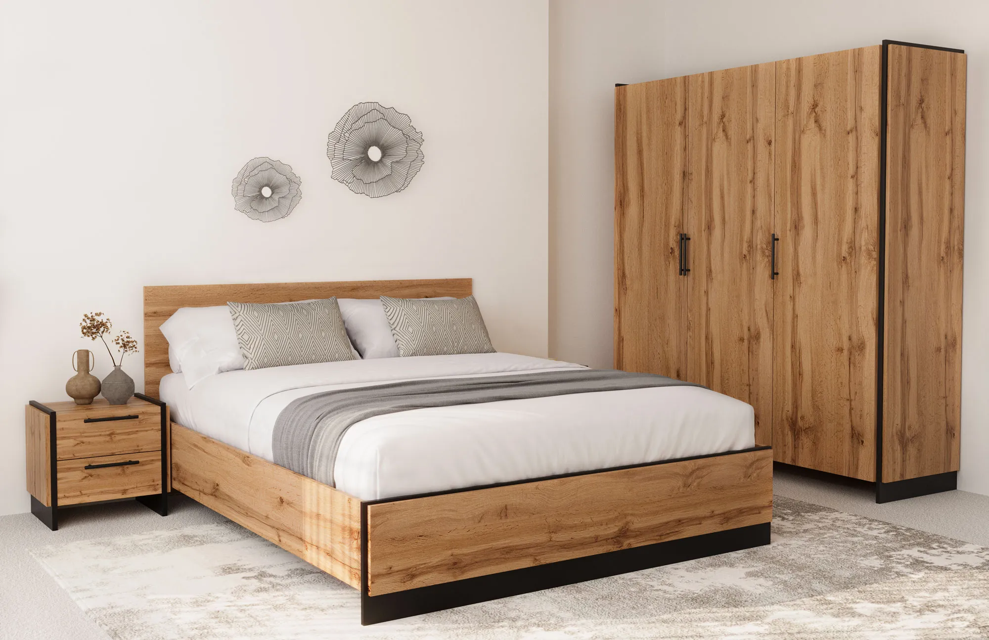 Sypialnia z wykorzystaniem łóżka z zagłówkiem Fellia 6X dąb wotan + czarny