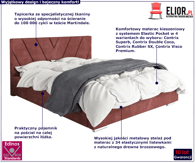 Tapicerowane łóżko Infermi 3X marki Elior to synonim wybitnego designu i najwyższej jakości w klasie deluxe. Mebel został precyzyjnie zaprojektowany z myślą o najbardziej wymagających użytkownikach, którzy w równym stopniu cenią jakość i wygodę oraz walory dekoracyjne mebla. Podstawę łóżka Infermi 3X tworzy skrzynia o grubości 1,6 mm, wykonana z drewna naturalnego i płyty meblowej zbudowanej z włókien drzewnych i związków organicznych oraz uszlachetnionej cienkimi filmami melaminowymi w celu zwiększenia jej trwałości. Na skrzyni obłożonej profesjonalną pianką o grubości T25 i tapicerowanej szlachetną tkaniną welwetową lub ekoskórą opiera się doskonały jakościowo metalowy stelaż z 34 sprężynujących listewek z naturalnego drewna brzozowego. Tak wykonany stelaż ułatwia cyrkulację powietrza pod materacem, co pozytywnie wpływa na jakość snu oraz wydłuża żywotność materaca. Dodatkowym atutem łóżka Infermi 3X jest praktyczny pojemnik na pościel, bardzo łatwo otwierany przy pomocy specjalistycznych podnośników gazowych. Tak wykonane łóżko Infermi 3X marki Elior to fenomenalny mebel, który nie tylko rewelacyjnie zaaranżuje Twoje wnętrze, ale zapewni wyjątkowy odpoczynek i pełnowartościowy, zdrowy sen.