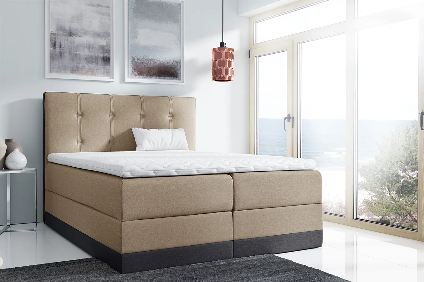 Łóżka kontynentalne są wysokie, eleganckie i pozwalają się doskonale wyspać. Pasują do przestronnych sypialni, którym nadają wytwornego i luksusowego charakteru. Świetnie sprawdzą się także w niewielkich wnętrzach, bo mimo pozornie dużych gabarytów, łóżka kontynentalne są o 18 cm węższe od tradycyjnych łóżek z ramą. Skrzynia łóżka Tajo została wykonana z drewna i podwójnej płyty meblowej. W skrzyni mieści się podwójny pojemnik na pościel otwierany za pomocą podnośników sprężynowych. Bazę łóżka stanowi odporny na odkształcenia materac kieszeniowy Pocket oraz pianka wysokoelastyczna T30. Całość uzupełnia komfortowy topper z termoelastycznej pianki visco memory z funkcją pamięci. Pikowany zagłówek chroni ścianę przed przed zabrudzeniem i gwarantuje idealny komfort.