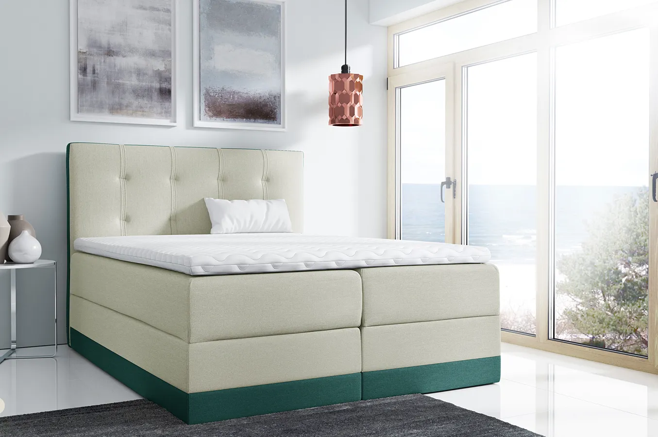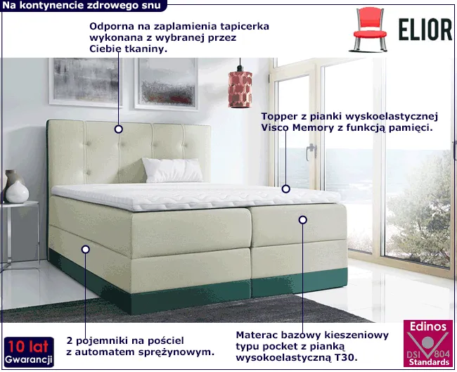 Łóżka kontynentalne są wysokie, eleganckie i pozwalają się doskonale wyspać. Pasują do przestronnych sypialni, którym nadają wytwornego i luksusowego charakteru. Świetnie sprawdzą się także w niewielkich wnętrzach, bo mimo pozornie dużych gabarytów, łóżka kontynentalne są o 18 cm węższe od tradycyjnych łóżek z ramą. Skrzynia łóżka Tajo została wykonana z drewna i podwójnej płyty meblowej. W skrzyni mieści się podwójny pojemnik na pościel otwierany za pomocą podnośników sprężynowych. Bazę łóżka stanowi odporny na odkształcenia materac kieszeniowy Pocket oraz pianka wysokoelastyczna T30. Całość uzupełnia komfortowy topper z termoelastycznej pianki visco memory z funkcją pamięci. Pikowany zagłówek chroni ścianę przed przed zabrudzeniem i gwarantuje idealny komfort.