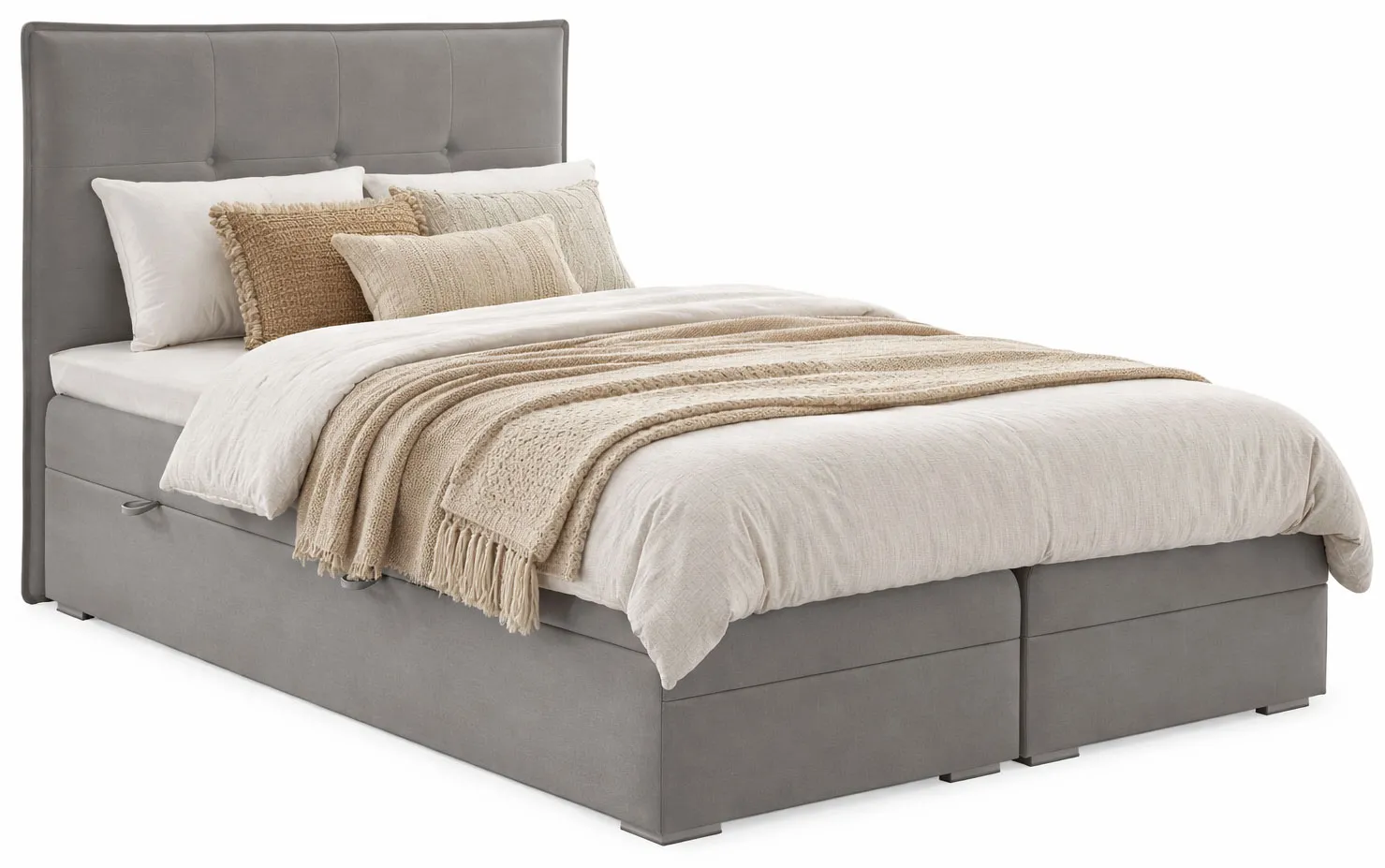 - Praktyczny pojemnik na pościel dla utrzymania ładu w sypialni, z automatami ułatwiającymi otwieranie.
