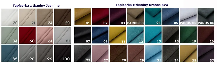 Designerska tapicerka łóżka Entis została wykonana z odpornej na uszkodzenia tkaniny tkaniny typu plusz Kronos 8VX lub Jasmine. Do wyboru masz aż 36 kolorów od pasteli po głębokie i nasycone kolory: