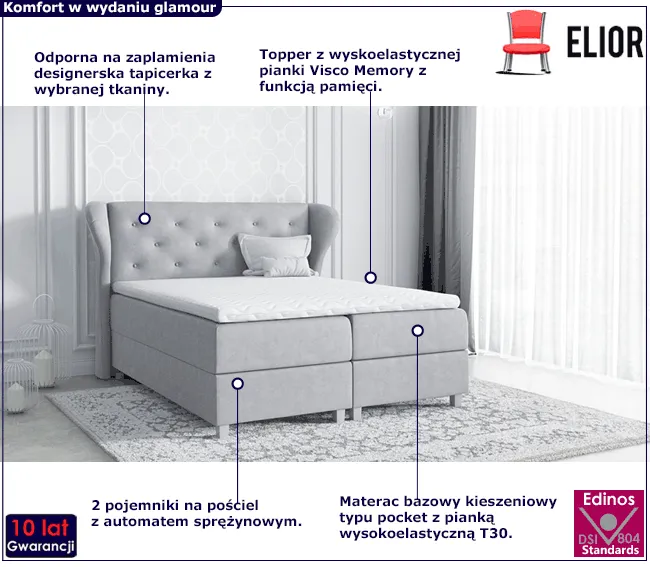- Łóżko wyposażone jest w komfortowy pojemnik na pościel, materac o twardości H3 na sprężynach kieszeniowych pocket oraz topper (materac nawierzchniowy) z pianki VISCO o grubości 5 cm.