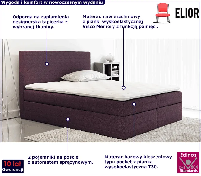 - Łóżko wyposażone jest w komfortowy pojemnik na pościel, materac o twardości H3 na sprężynach kieszeniowych pocket oraz topper (materac nawierzchniowy) z pianki VISCO o grubości 5 cm.