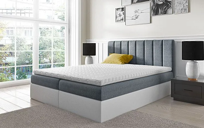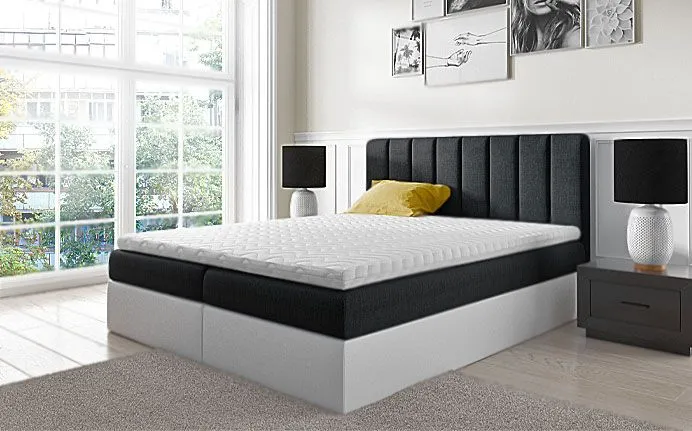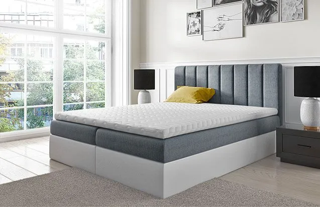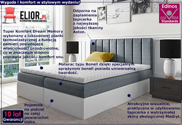 - Łóżko wyposażone jest w komfortowy pojemnik na pościel, materac typu Bonell obłożony obustronnie wysokoelastyczną pianką T30 oraz toper Komfort Dream Memory wykonany z termoelastycznej luksusowej pianki Visco Memory 6 cm z funkcją pamięci.