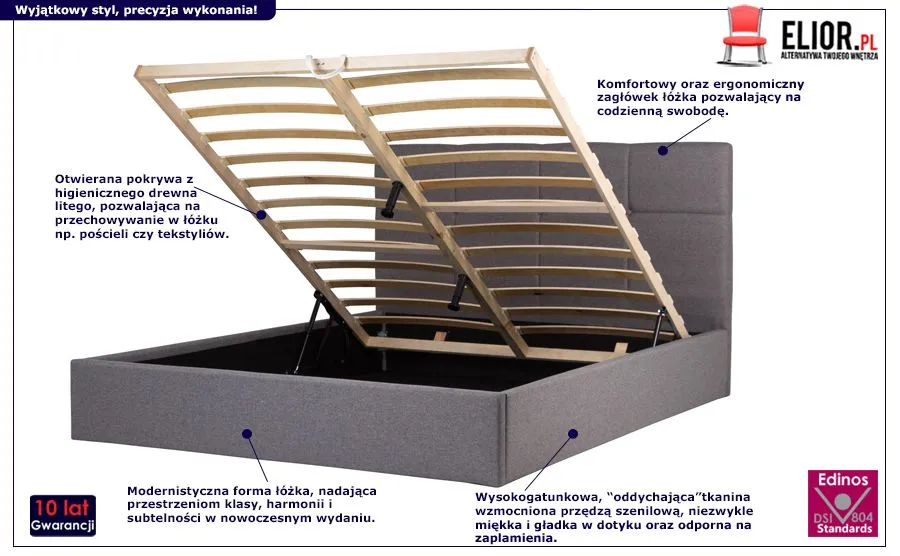 Majos posiada bezpieczną podstawę, chroniącą podłogę przed zarysowaniem. Całość to stabilna, trwała konstrukcja, która zapewnia wyjątkową wygodę w sypialni. Majos zostało zaprojektowane z wysokogatunkowej, „oddychającej” tkaniny, która została wzmocniona przędzą szenilową. Tkanina posiada szlachetne ultramikrowłókna, dzięki czemu cechuje się wyjątkową miękkością oraz gładkością w dotyku. Ponadto profesjonalna tkanina cechuje się odpornością na ścieranie, a jej odpowiednia struktura została wykonana według najnowszych technologii zapobiegających zabrudzeniom. Otwierana konstrukcja łóżka to naturalne, w pełni higieniczne drewno lite posiadające właściwości antystatyczne. Na drewnie litym kurz łatwo nie osiada, a więc jest to znakomita propozycja dla alergików. Majos to łóżko wykonane w innowacyjnej, modernistycznej kolorystyce, która zachwyca już od progu. Tkanina to wyjątkowy, niezwykle gustowny kolor, który został dopełniony ponadczasowym drewnem. Duży zagłówek oraz wyjątkowa miękkość obicia łóżka pozwalają na swobodę, wyjątkowy relaks i po prostu nieograniczoną wygodę. Komfortowe łóżko Majos zapewni Ci zarówno chwile upragnionego wypoczynku w samotności, jak i niezapomniane chwile z bliską osobą.