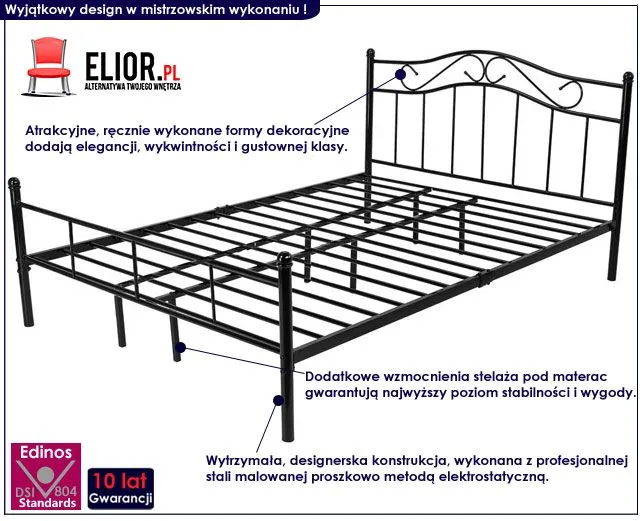 - Konstrukcja łóżka wykonana jest z profesjonalnej, podwójnie hartowanej stali, malowanej proszkowo metodą elektrostatyczną.