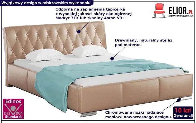 Zjawiskowe łóżko Tonkin wyróżnia się nie tylko swoją unikalną formą, ale także zastosowaniem materiałów najlepszej jakości. Designerska pikowana tapicerka mebla pokryta została w zależności od modelu: łatwą do utrzymania w czystości ekoskórą Madryt 7TX (skórą ekologiczną) lub odporną na uszkodzenia tkaniną Aston V3+. Ekoskóra używana przy produkcji mebli marki Elior jest o wiele bardziej odporna na słońce oraz substancje płynne , co pozwala Ci na długie i bezpieczne użytkowanie. Już nie musisz się martwić, że rozlana kawa spowoduje konieczność wymiany mebla. Skóra ekologiczna Madryt 7TX marki Elior została pokryta warstwą polichlorku winylu. Tkanina Aston V3+ charakteryzuje się podwyższoną odpornością na uszkodzenia mechaniczne oraz chemiczne, a także łatwością w czyszczeniu. Zastosowanie dokładnie wyselekcjonowanych ultramikrowłókien o objętości aż do 24-razy drobniejszej od ludzkiego włosa, sprawia że materiał nie zmienia swojej barwy po przetarciu tkaniny ręką. Efektowne srebrne nóżki wyprodukowano z profesjonalnej stali chromowanej który nadaje niesamowity i trwały design.