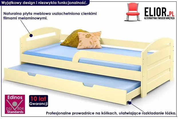 Łóżko to najważniejszy mebel każdego z nas. Mebel, z którym spędzamy minimum 1/3 życia. Zadbaj więc o to, aby właśnie łóżko Twojego dziecka prezentowało się magicznie i naprawdę wyjątkowo, gwarantując przy tym jakże potrzebny, zdrowy oraz bezpieczny sen. Łóżko Nofioz Vanilla marki Elior wykonane zostało w całości z naturalnej płyty meblowej w pełnym połysku. Mebel wyróżnia się nie tylko swoją unikalną formą ale także zastosowaniem materiałów najlepszej jakości. To dlatego cieszy się on powodzeniem wśród osób lubiących ciekawe rozwiązania. Użyta do produkcji łóżka płyta meblowa została uszlachetniona cienkimi filmami melaminowymi. Posiada także specjalne włókna ułożone różnkokierunkowo o strukturze sinusoidalnej, co zapewnia nadanie jej cech jakościowych oraz wytrzymałościowych. Designerska konstrukcja mebla wykonana została ze specjalnej płyty komórkowej, której główną zaletą jest redukcja ciężaru bez utraty stabilności oraz innych funkcji konstrukcyjnych.